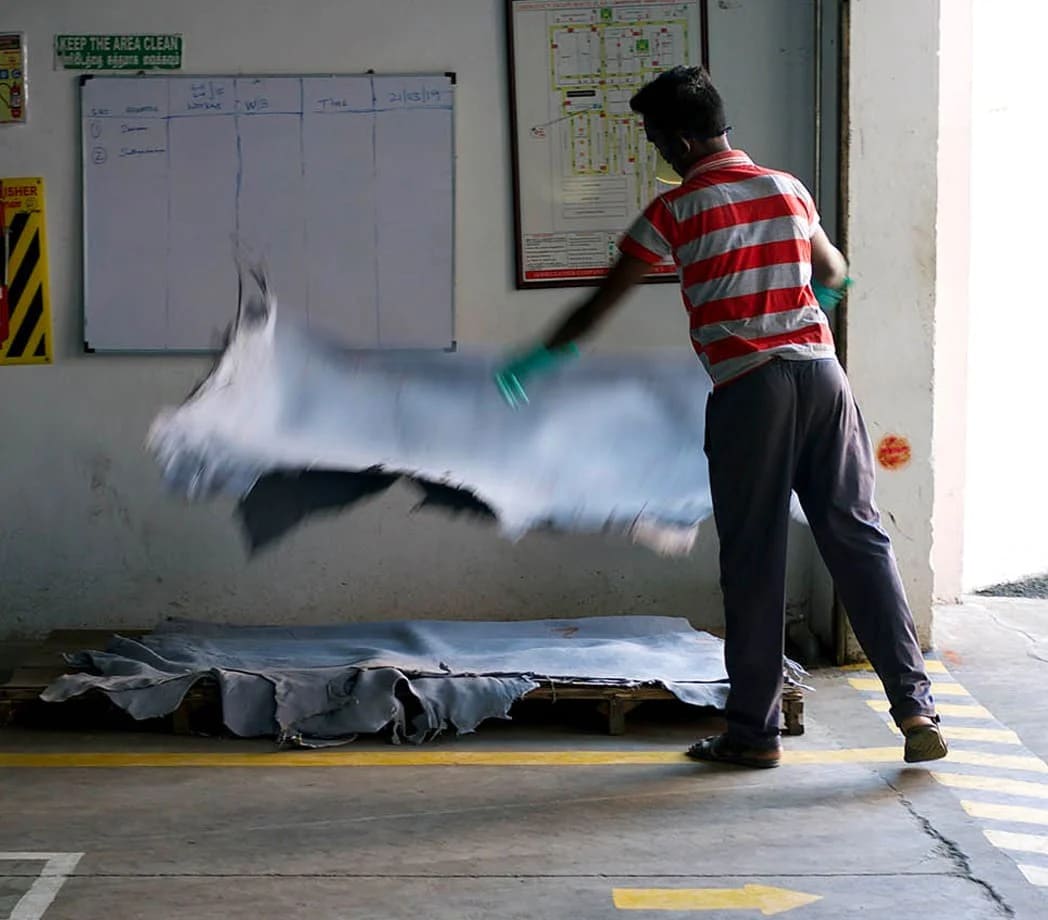Wir sammeln weggeworfene Materialien und stellen so beispielsweise Riemen aus Plastikflaschen oder Aussensohlen aus landwirtschaftlichen Abfällen her. Weniger Ressourcen, weniger Impact.